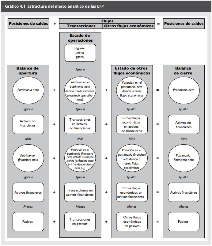 El marco de las EFP está compuesto por un conjunto de cuatro estados financieros resumidos relacionados entre sí que integran flujos y saldos. Tres de estos pueden combinarse para demostrar que todas las variaciones en los saldos, desde el principio hasta el final del período, son el resultado de los flujos de ese período. Son los siguientes: