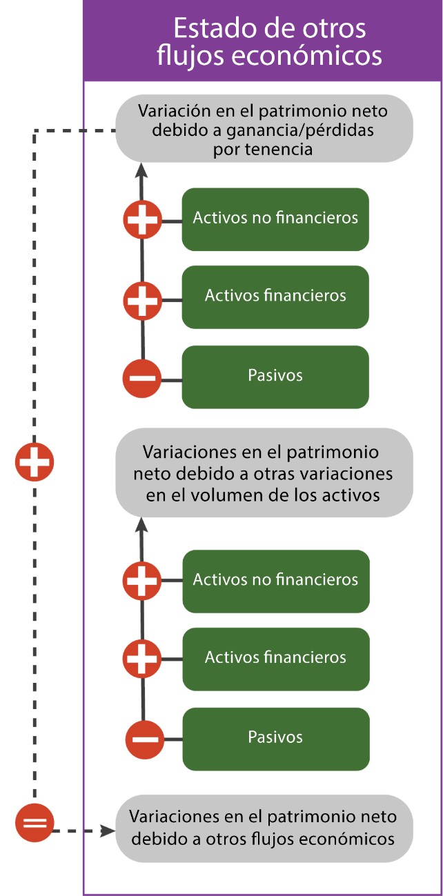 El estado muestra el efecto sobre una posición financiera de una unidad de dos tipos de otros flujos económicos: ganancias/pérdidas por tenencias y otras variaciones en el volumen de los activos y pasivos. Dichas variaciones en el patrimonio neto ocurren debido a eventos sobre los cuales el gobierno no tiene control directo y que no están directamente relacionadas con la política fiscal. Estos otros flujos económicos se clasifican según el tipo de activo o pasivo afectado.