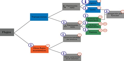 Los flujos implican variaciones en el valor, volumen o composición de los activos, pasivos y patrimonio neto de una unidad institucional. Todos los flujos se clasifican como transacciones u otros flujos económicos, como se explica a continuación.