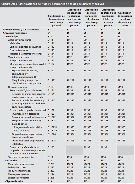 Para los activos no financieros, los otros tres de los cinco dígitos de su código siempre son los mismos, mientras que para los instrumentos financieros (activos) el segundo dígito de su código varía en función de si el instrumento es mantenido como activo o pasivo, como se describe arriba. El tercer dígito varía según la residencia del titular, y los cuatro dígitos identifica el tipo de instrumento.