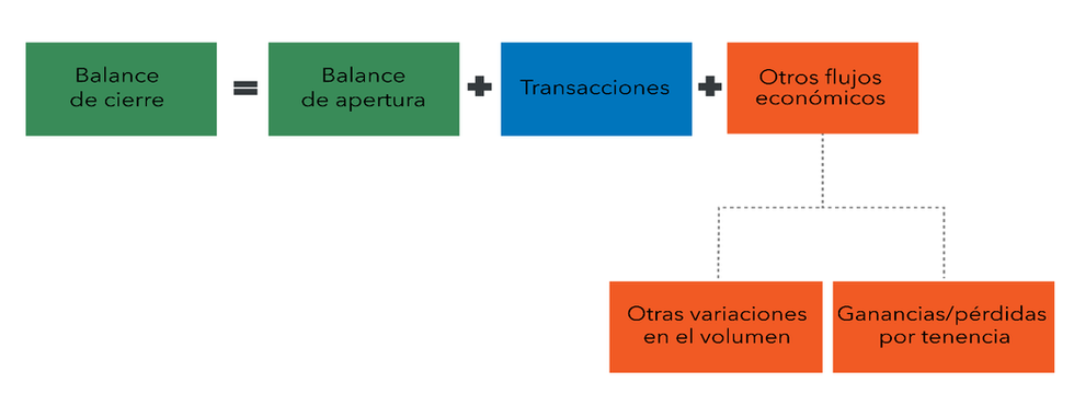 Las ganancias/pérdidas por tenencia afectan tanto los activos financieros como los no financieros y son el resultado de variaciones en los precios. Debería hacerse un esfuerzo para identificar y registrar las variaciones en los precios (ej. tasa de cambio). Sin embargo, en la práctica, los datos sobre las variaciones en los precios (revalorización) no están fácilmente disponibles y, en general, se calculan como residuo a partir de la identidad básica del marco integrado de las EFP (balance de cierre = balance de apertura + transacciones + total de otros flujos económicos). Es decir, si conocemos la posición de saldo de apertura y de cierre de un activo, así como también el valor de las transacciones en ese activo, entonces cualquier otra variación en el valor del activo debe ser el resultado de otro flujo económico.